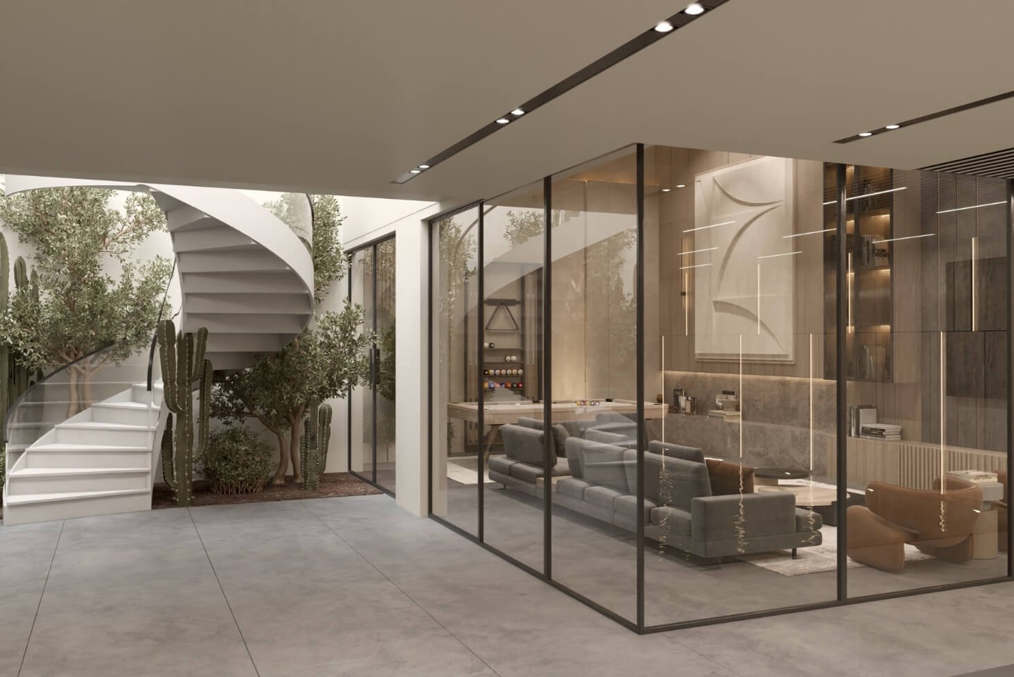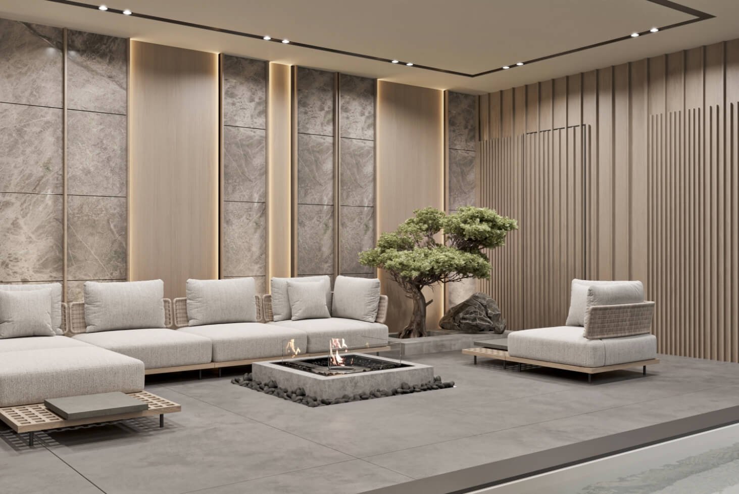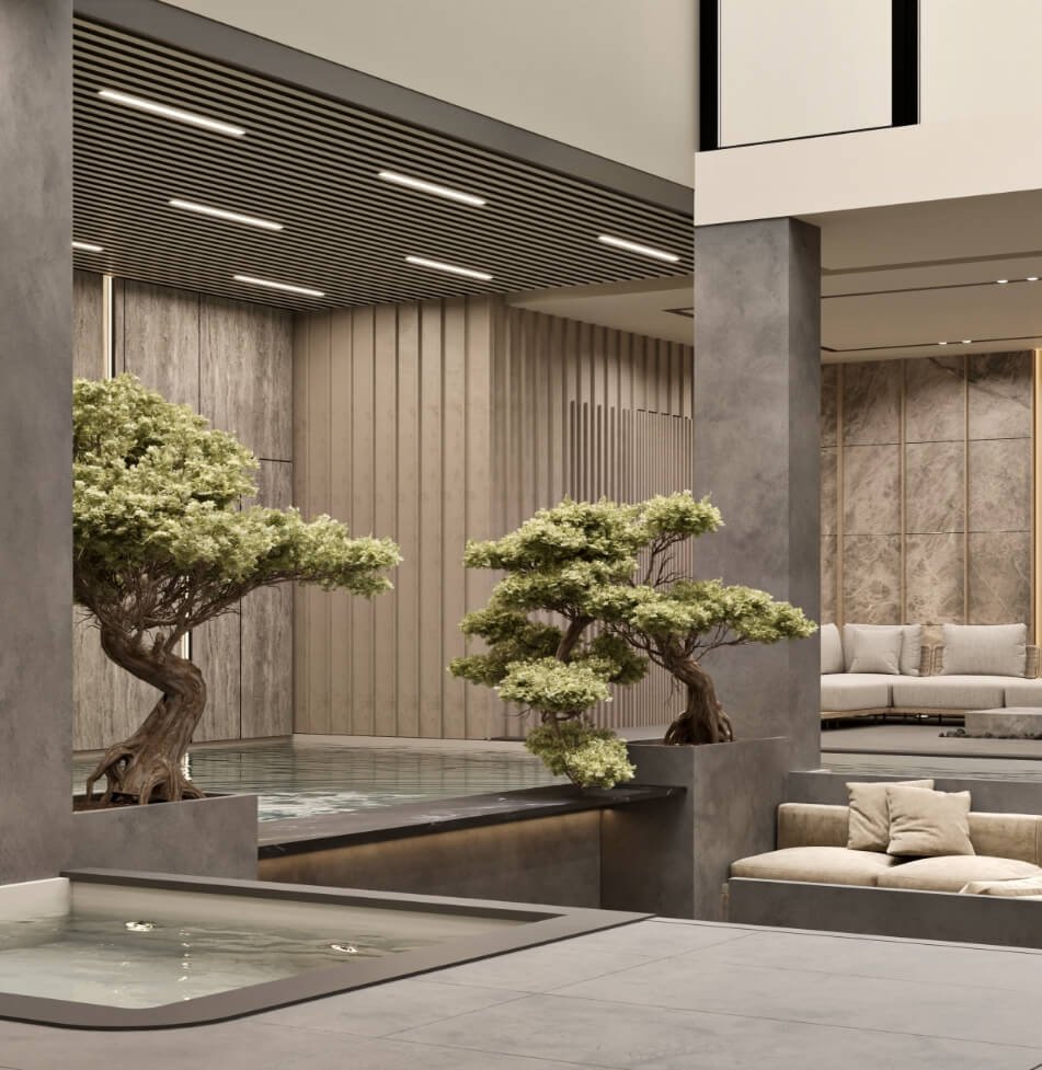 The design intent behind IT Villa was to create a home that celebrated family gatherings and quality time. And from the intent rose the idea of providing open spaces for multipurpose activities. By incorporating different notural elements like wood, stone and trees, oll the spaces become inviting and colming ot the some time.