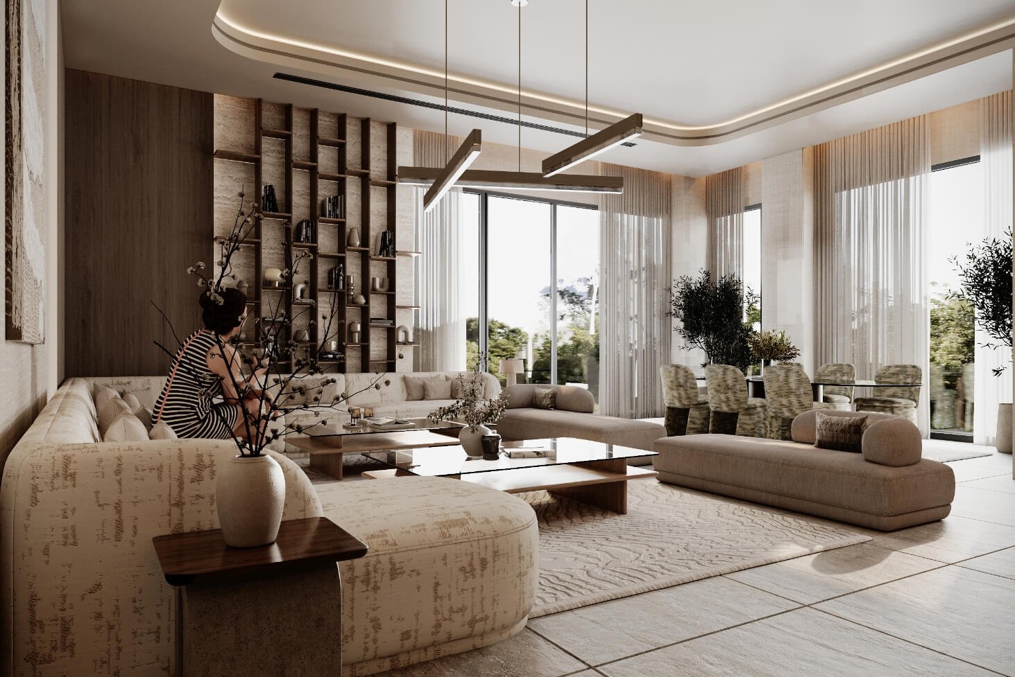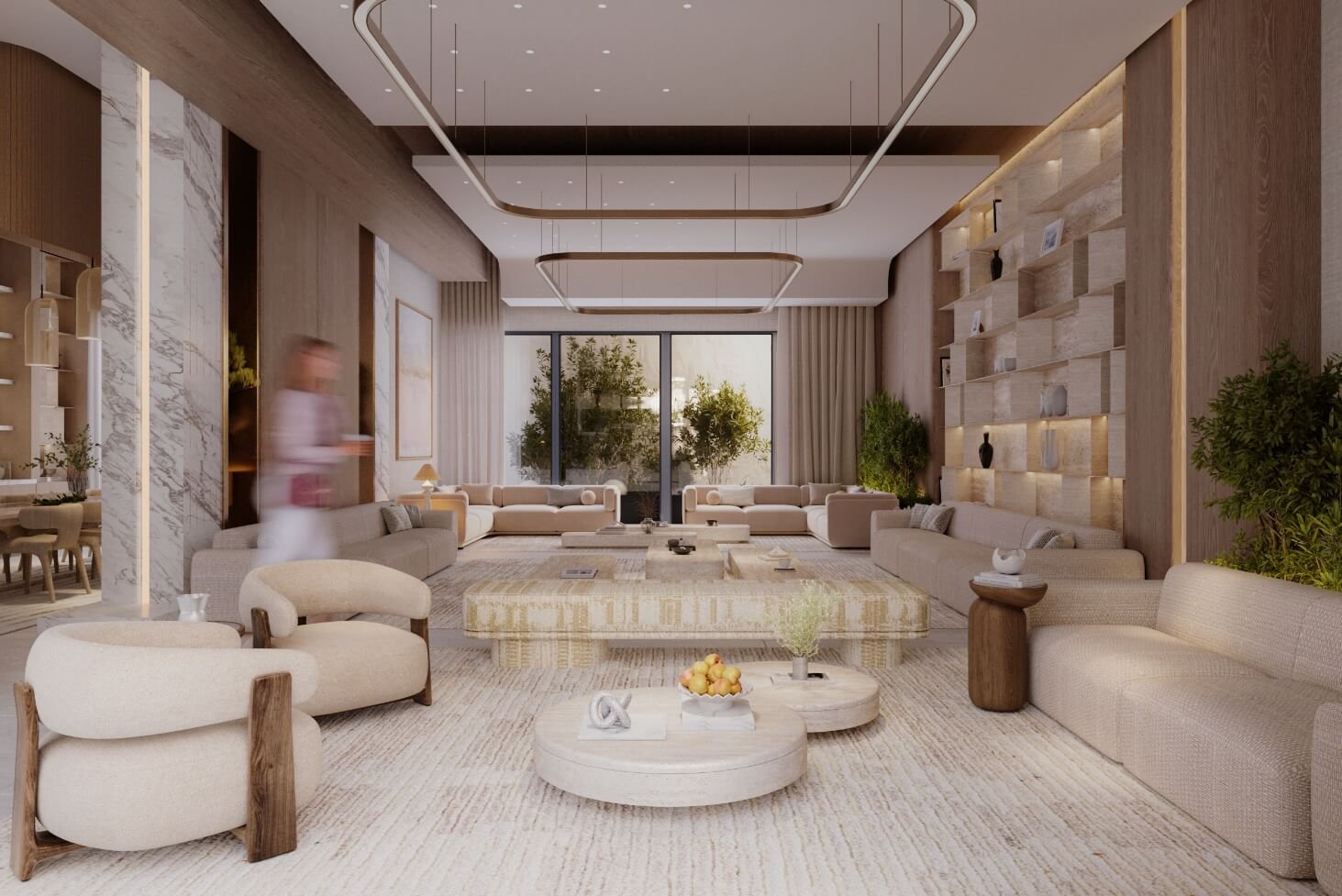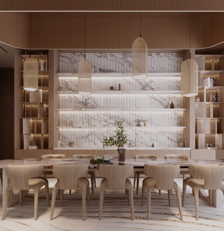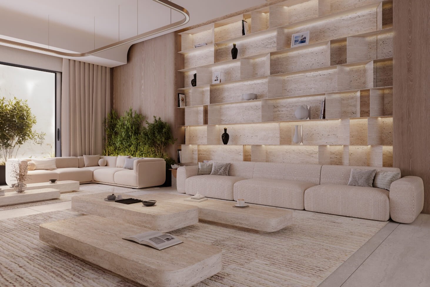 SB Villa is home to a 3-generation family in the suburbs of Kuwait. Although each floor houses a nuclear family, the house as a whole portrays a cohesive concept that is simple, modern and comfortable. It’s quiet luxury seeps through from the neutral color polette to the lush fabric textures ond variety of material selections.