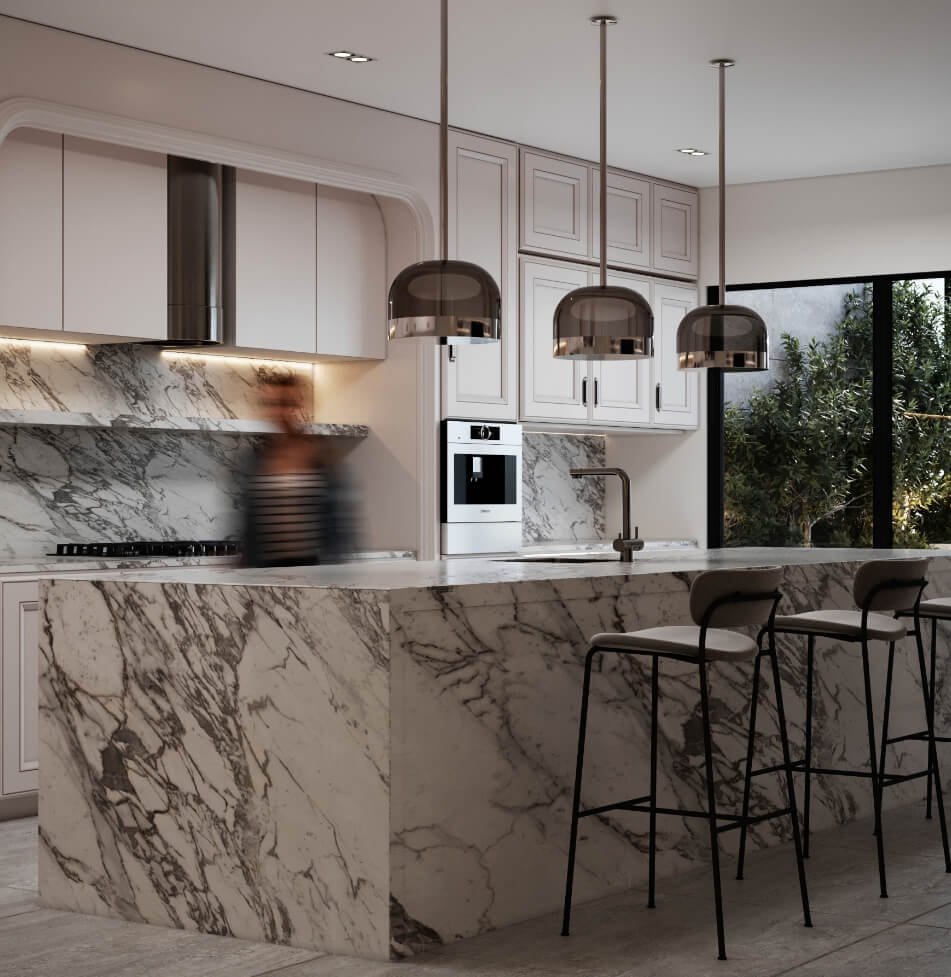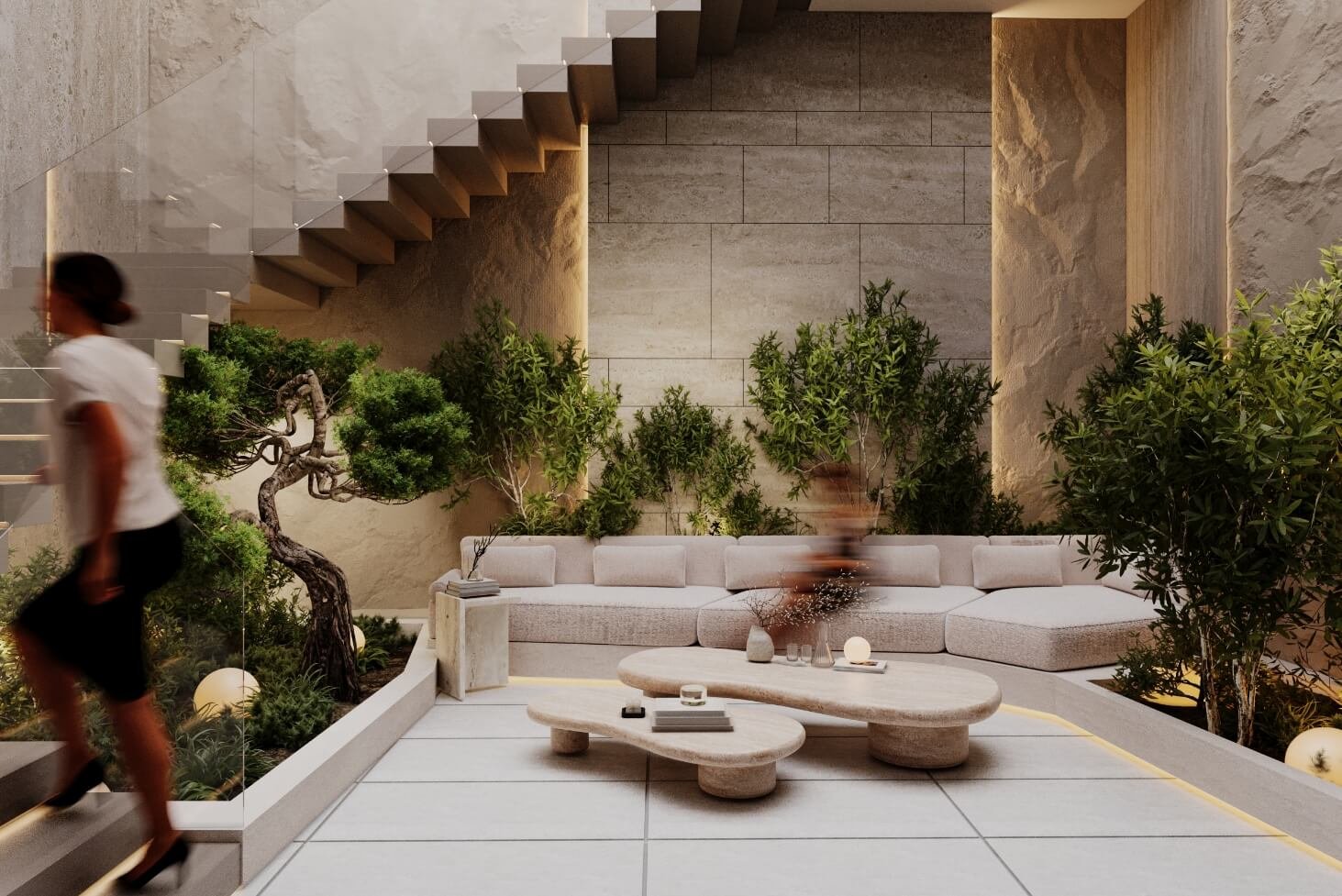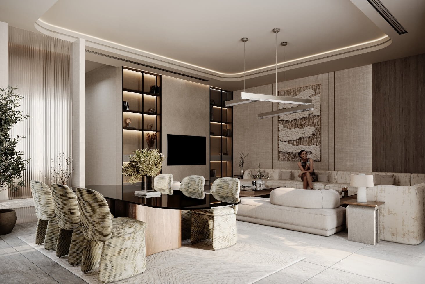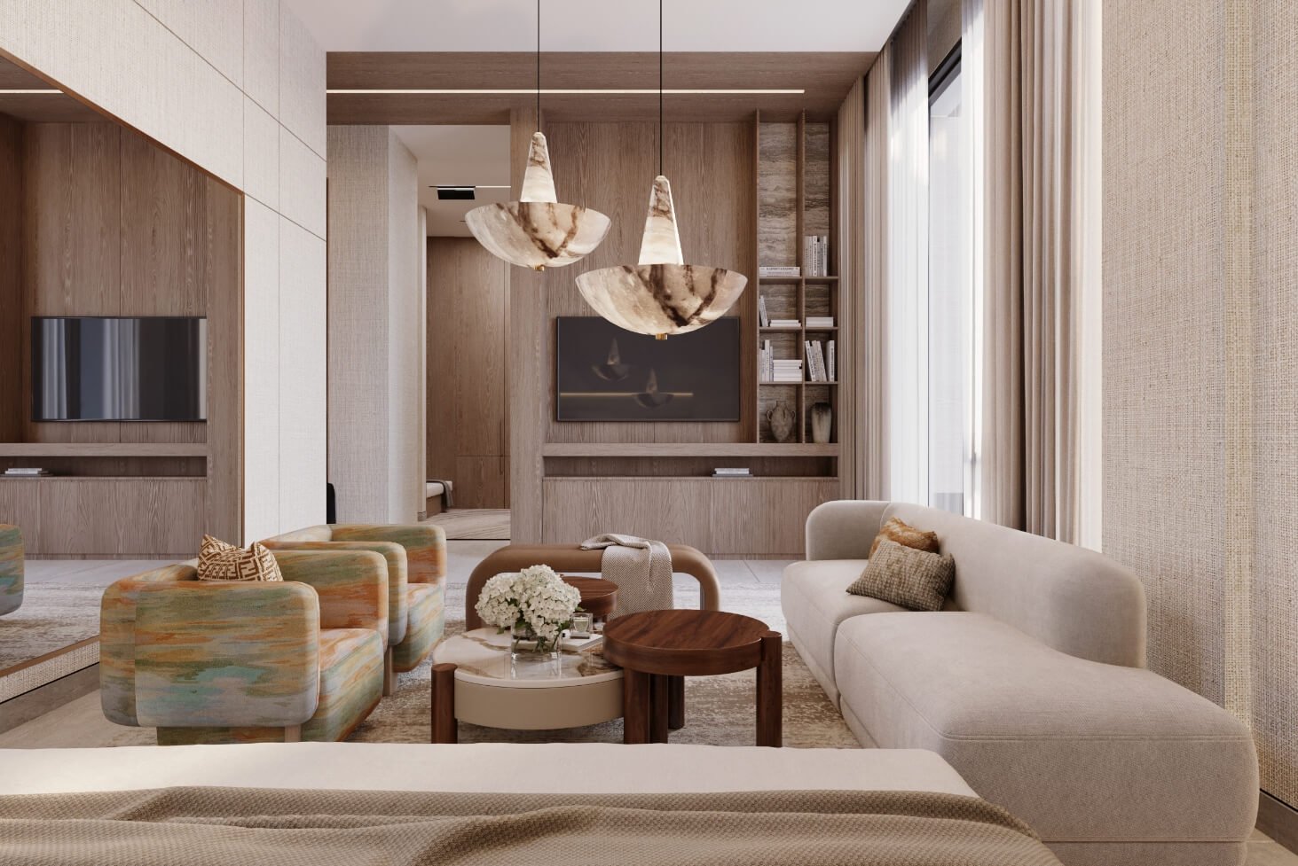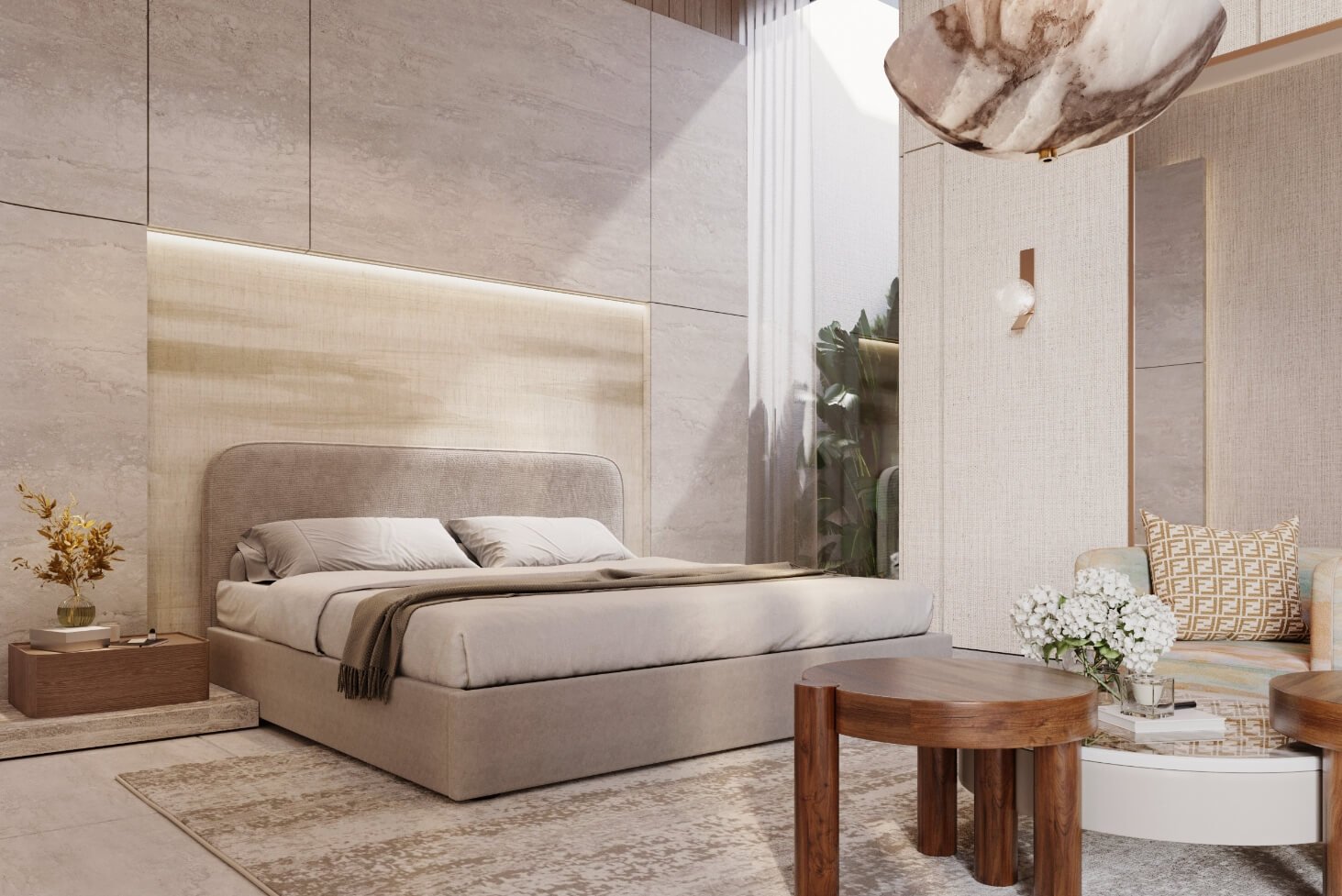 SB Villa is home to a 3-generation family in the suburbs of Kuwait. Although each floor houses a nuclear family, the house as a whole portrays a cohesive concept that is simple, modern and comfortable. It’s quiet luxury seeps through from the neutral color polette to the lush fabric textures ond variety of material selections.